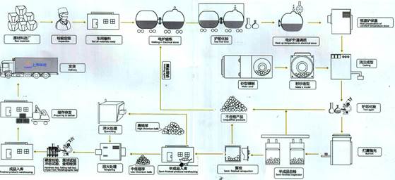 高鉻合金鑄球及鑄段是市場上使用量比較大的球磨機(jī)用耐磨鑄造球,尤其是經(jīng)過油淬火的高鉻球,具有很高的硬度和耐磨性。鉻作為最耐磨的合金元素,在高鉻球成分占比超過了10%,甚至超高鉻球的鉻元素占比達(dá)到了26%,屬于耐磨球中的牛魔王。我國鑄造高鉻球技術(shù)在改革開放后迎來了較快的發(fā)展,從傳統(tǒng)的人工澆鑄已發(fā)展到如今的自動(dòng)化恒溫澆鑄生產(chǎn),工藝提升的同時(shí),產(chǎn)品質(zhì)量也有了質(zhì)的飛躍。流程圖: